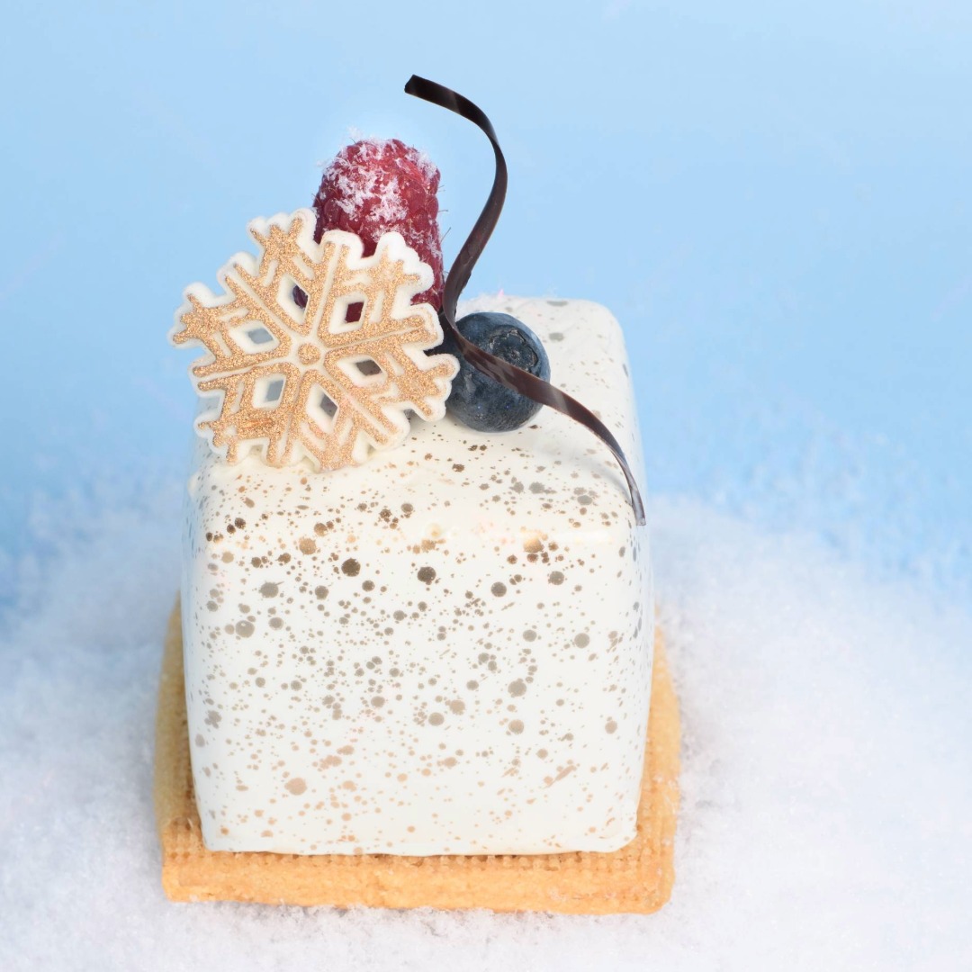 Fluffy strawberry cake intertwined with bright raspberry pâte de fruit jelly, zesty lemon curd and house-made strawberry jam veiled in a light vanilla bean white chocolate mousse and an elegant white chocolate glaçage; Finished with dusted berries and golden sugar snowflake.