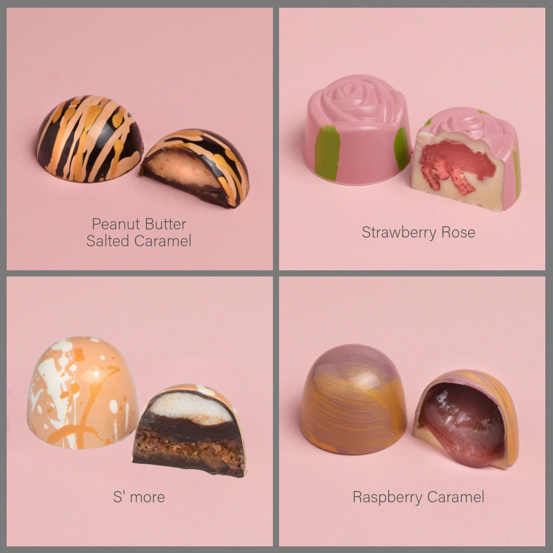 More than confections; these exquisite hand-painted and hand-shelled chocolates are celebrations of life's sweetest moments; Available in Raspberry Caramel, S'more, Strawberry Rose, Peanut Butter Salted Caramel and Cinnamon Pecan (ghost; Not pictured)