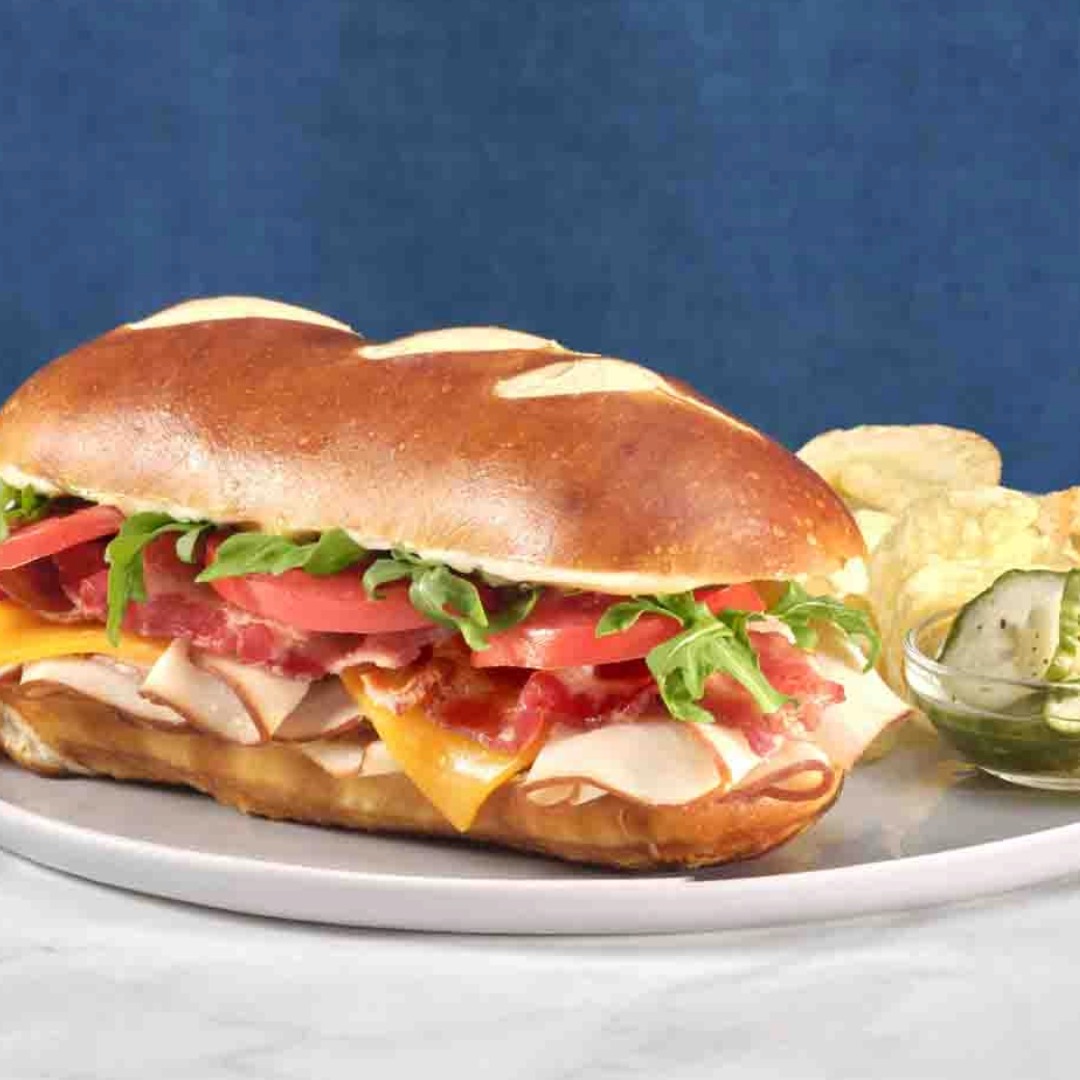 Roasted, sliced turkey breast on a fresh-baked pretzel roll topped with aged cheddar cheese, applewood-smoked bacon, vine-ripe tomatoes, arugula, peppercorn aioli and a tangy honey mustard. Served hot with chips & house-made pickles.